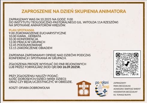 Serdecznie zapraszamy na dzień skupuenia animatorów kręgu, który odbędzie się 4.10.2025 w Instytucie Teologiczno-Pastoralnym w Rzeszowie.